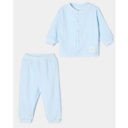 Велюровый голубой комплект для мальчика Моя Горошинка из однотонных брюк в рубчик и распашонки с нашивкой.