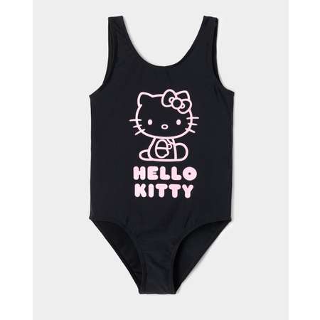 Чёрный слитный купальник для девочки Hello Kitty с контрастным принтом.