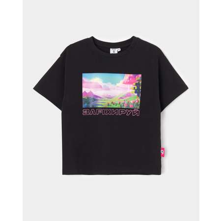 Чёрная футболка для девочки Futurino Fashion с красочным пиксельным принтом.
