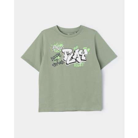 Футболка цвета хаки для мальчика Futurino, декорированная стильным принтом с надписями в стиле граффити.