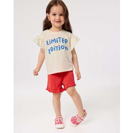 Шорты для девочки BabyGo кораллового цвета с узором, декорированы оборками.