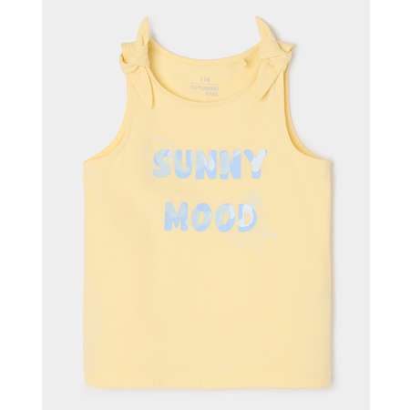 Жёлтая летняя майка для девочки Futurino с декоративными узелками на плечиках и принтом "Sunny mood".