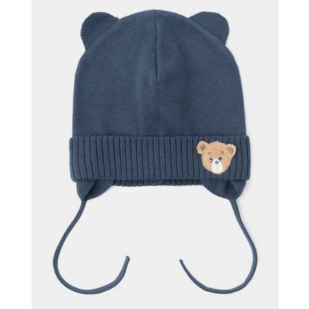 Синяя шапка на завязках для мальчика BabyGо с ушками и объёмной нашивкой в виде медвежонка.