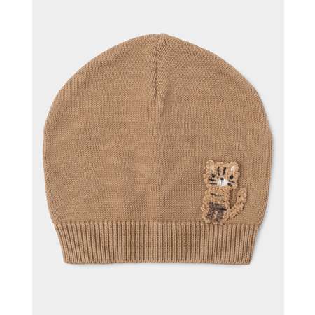 Бежевая шапка для мальчика BabyGо с объёмной нашивкой в виде котика.