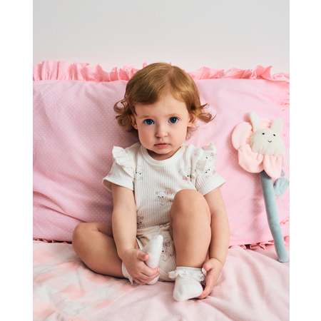 Белое боди в рубчик для девочки BabyGо с нежным цветным принтом и оборками.