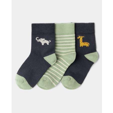 В комплекте BabyGо три пары носков для мальчика - тёмно-серые с цветным принтом и зелёные в полоску.