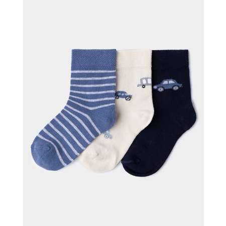 В комплекте BabyGо три пары носков для мальчика - тёмно-синие и молочные с цветным принтом, а также синие в полоску.