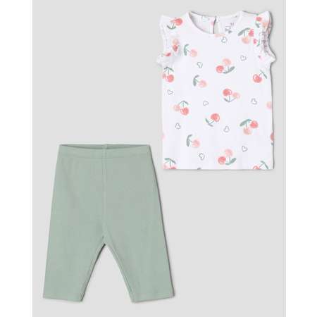 Летний комплект для девочки BabyGo из однотонных зелёных велосипедок и белой майки с ягодным принтом.