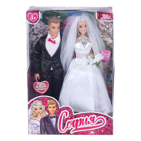 Прекрасная невеста София одета в белое свадебное платье в пол без рукавов, её образ дополняют стильные серьги, колье и нежная фата с диадемой. А Алекс одет в классический чёрный костюм с белой рубашкой с ярко-розовым галстуком-бабочкой. Одежду и аксессуары легко снять и надеть. У Софии длинные красивые волосы, которые хозяйка куклы сможет заплетать в разные причёски. Детально проработанный дизайн игрушки вдохновит девочку на множество интересных игровых сюжетов.